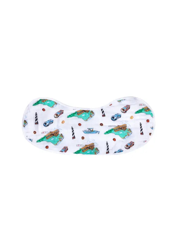 Celebrate some of the unique things people love about North Carolina. These unisex burp and bibs are great gifts. Everyone needs more bibs. Make your own multipacks. Extremely soft and extremely thick, they will lap up everything thrown at them. These are also very large and wrap fully around and can be comfortably worn for hours The fact that they function both as burp cloths and bibs make it a great transitional item that people can use for years. It can be used as a burp cloth in the early months, and then it snaps to convert into a full coverage bib once solid foods are introduced. Size: 10” x 24”; Fabric: Bamboo Rayon, Cotton