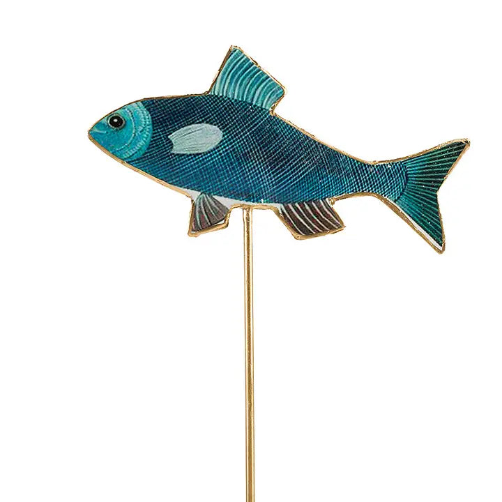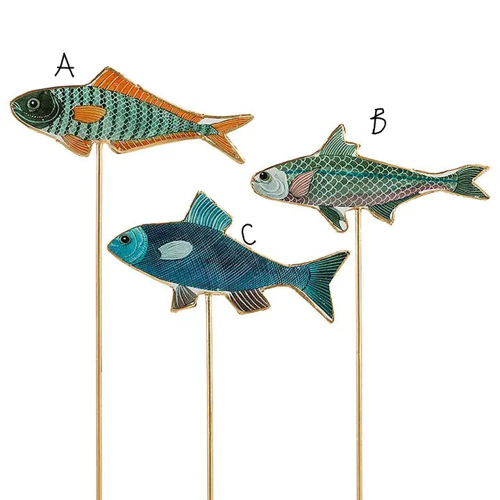 Add a unique, aquatic decorative accent just about anywhere with these charming, eye-catching Swimming Fish Stakes. Crafted out of metal and glass and available in three assorted styles, each of these decorative stakes features a colorfully rendered design that's sure to stand out in anything from potted plants and flowers to wreaths, mantles and more. 20" H