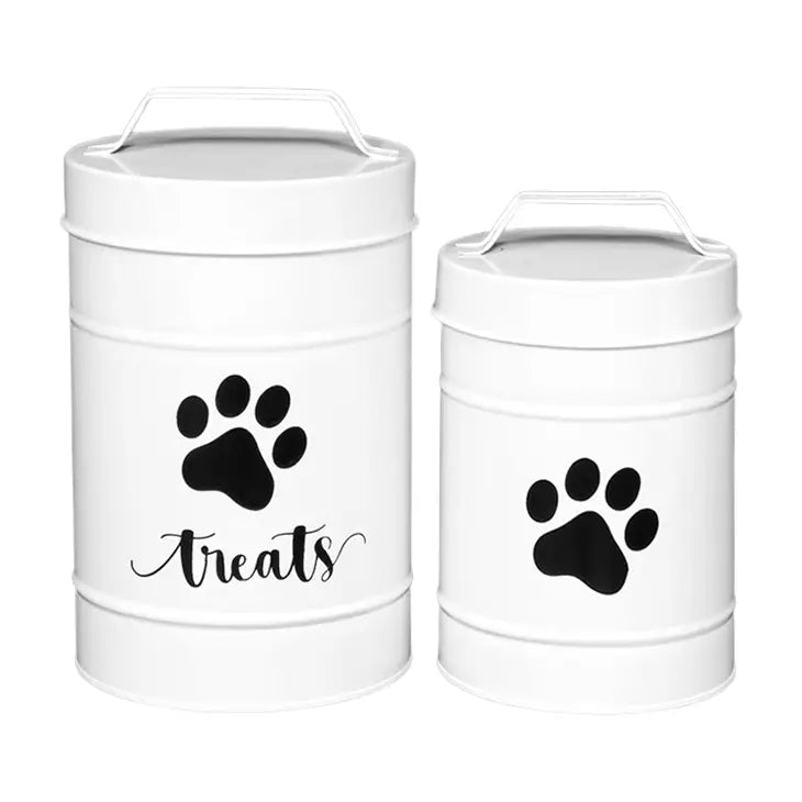 These metal containers are perfect for a pet-centric home! Both of them are a sleek, bright white metal and have lids with handles. Each feature a bold black paw print illustration and the larger variation has flowing elegant black script that reads "treats." Don't confuse these with your regular cookie jar!