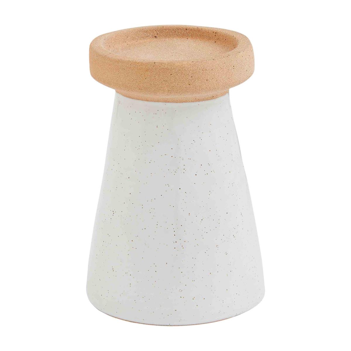 These Terracotta Candleholders are perfect for tabletop decor. The candlesticks are made of glazed and exposed terracotta. The candleholder features white and tan color block sections.